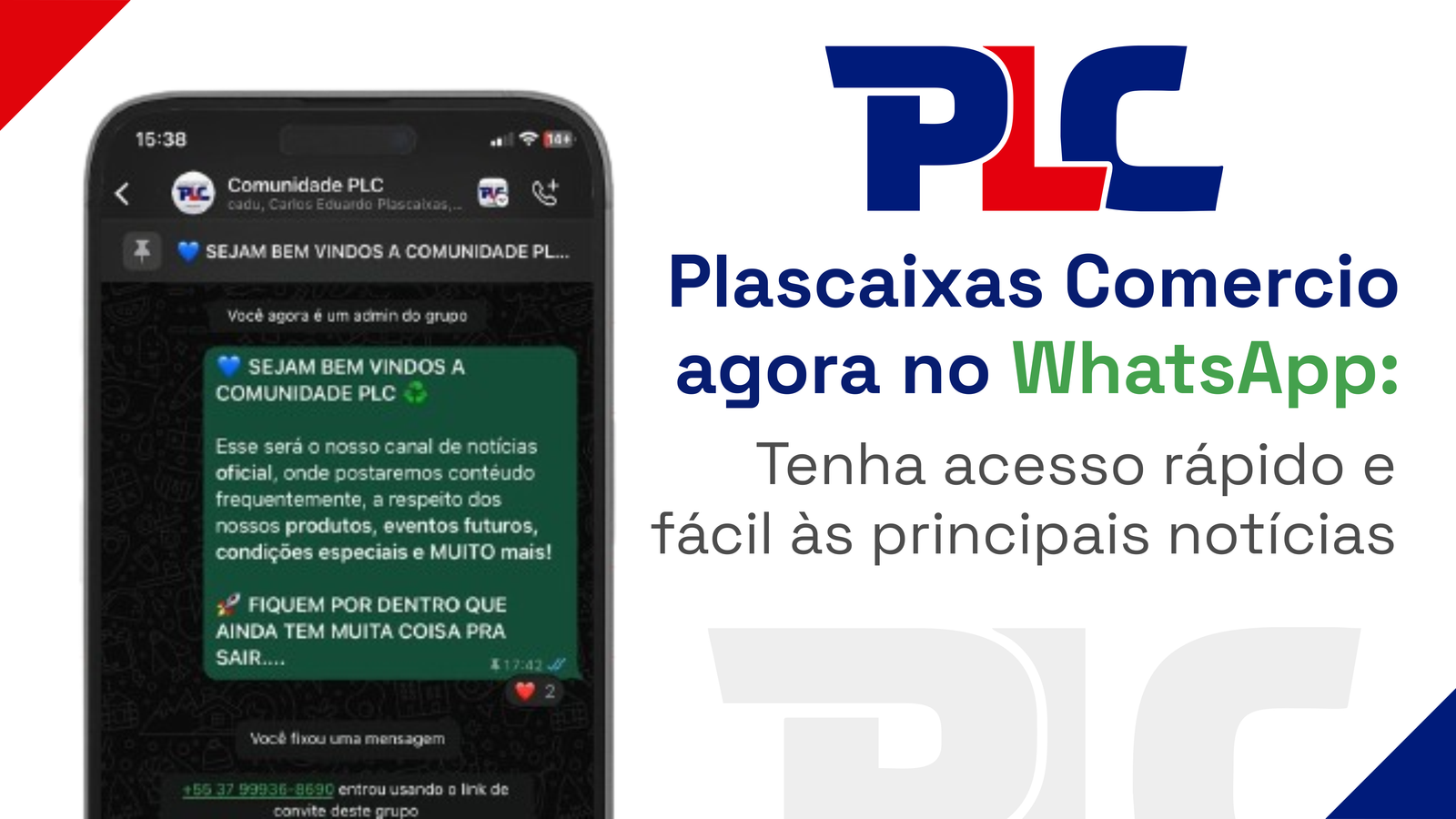 Com a comunidade da Plascaixas Comercio no WhatsApp, você pode receber as principais notícias diretamente no seu celular, de forma clara, objetiva e direta. Sem precisar abrir o Blog ou acessar outros canais de comunicação, você terá apenas as informações essenciais, de forma resumida e fácil de absorver.
